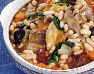 Na véspera, salgue o chispe, a orelha o pernil e o entrecosto, tudo cortado em pedaços, demolhe o feijão. No próprio dia, coza o feijão em água com uma cebola descascada e os cravinhos espetados nela. Descasque a cebola restante e os dentes de alho e pique ambos. Descasque a cenoura e corte-a em rodelas. Corte o chouriço de carne de igual forma e coza o chouriço de sangue em água. Quando estiver frio, corte-o em pedaços. Arranje a couve aos pedaços. Refogue a cebola e os dentes de alho picados no azeite, junte a cenoura e o chouriço de carne e refresque com o vinho branco. Acrescente a couve e as carnes desossadas e cortadas aos pedaços. Deixe estufar em lume brando até as carnes estarem cozidas. Junte o feijão cozido com o respectivo caldo de cozedura e tempere com sal, pimenta e cominhos em pó; sirva.