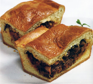 Para o recheio, corte os enchidos aos cubos pequenos e pique a cebola e os alhos. Refogue no azeite, acrescente o louro e a carne de vaca e deixe cozinhar por cinco minutos. Junte o concentrado de tomate, sal e piripiri e regue com o vinho e a água. Deixe apurar com o tacho tapado, em lume brando, por 25 minutos.
