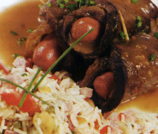 Tempere o fígado com os alhos laminados, metade do vinho, sal e pimenta; deixe marinar. Descasque as batatas, corte-as em rodelas e coza-as em água com sal. Retire o fígado e os alhos do líquido da marinada e frite-os no azeite. Retire-os da gordura e reserve. Corte as cebolas em rodelas e aloure-as no azeite utilizado, juntamente com a folha de louro. Refresque com o restante vinho. Junte o fígado e o alho reservados e tempere com colorau e cominhos. Envolva tudo, tape e deixe cozinhar tapado, durante dois minutos. Regue com o vinagre e ferva por um minuto.