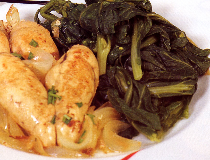 Coza os grelos em água temperada de sal. Num tacho refractário, coloque as cebolas cortadas em gomos, o alho esmagado e as ovas. Tempere o preparado com sal e pimenta e adicione-lhe o azeite. leve ao forno a 200ºC, por 20 minutos. Vá regando com uma mistura do caldo de peixe com o vinho. Sirva as ovas com os grelos.
