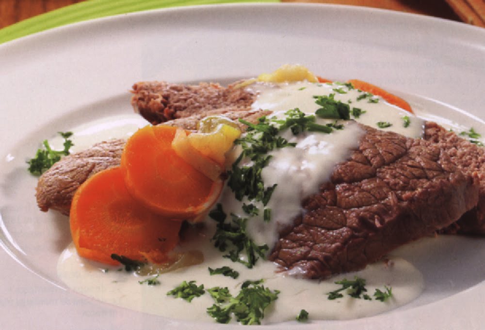Envolva 100 ml do caldo com as natas azedas, a mostarda e o molho de rábano picante, e deixe aquecer na panela. tempere com sal e pimenta. Corte a carne às fatias e sirva com o molho e a salsa. Acompanhe com batatas assadas.