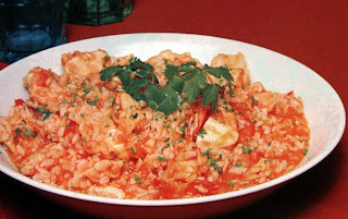 Descasque os camarões em cru, deite as cascas num tacho, junte-lhes água até ficarem cobertas, leve ao lume e deixe ferver. Mergulhe os tomates em água a ferver durante cerca de 20 segundos. Passe-os por água fria, retire-lhes a pele e as sementes e pique-os. Descasque a cebola e os alhos, pique tudo para um tacho, junte o louro e o azeite e leve a alourar até a cebola ficar macia. Junte o tomate e as línguas de bacalhau, mexa e deixe cozinhar durante 10 minutos. Adicione então o arroz e 6 dl do caldo da cozedura das cascas dos camarões, a ferver e coado. Mexa, tempere com sal e piripiri, mexa novamente e deixe cozinhar durante cerca de 30 minutos. Junte finalmente os camarões descascados, deixe cozinhar por mais 5 minutos, adicione os coentros previamente picados, e sirva de imediato.