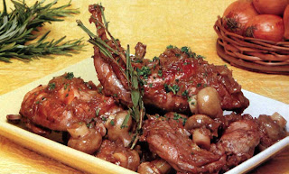Arranje o coelho, corte-o em pedaços, deite-os para uma taça e tempere-os com pimenta moída. Junte-lhe os alhos esmagados, a carqueja, o louro, o alecrim e o vinho, mexa e deixe marinar no frio de um dia para o outro. No dia seguinte, escorra o coelho e reserve a marinada. Leve ao lume um tacho com azeite, deixe aquecer, junte os pedaços de coelho e deixe cozinhar até ficarem bem douradinhos de ambos os lados. Junte a cebola picada, mexa e deixe cozinhar durante 10 minutos. Junte então a marinada ao tacho, mexa, tape e deixe cozinhar em lume brando durante 45 minutos, mexendo de vez em quando. Se necessário, adicione um pouco de água. Quando o coelho estiver quase cozinhado, junte-lhe os cogumelos inteiros, previamente lavados e escorridos, e deixe acabar de cozinhar. Coloque numa travessa ou prato de serviço e sirva decorado com salsa picada e acompanhado a gosto.