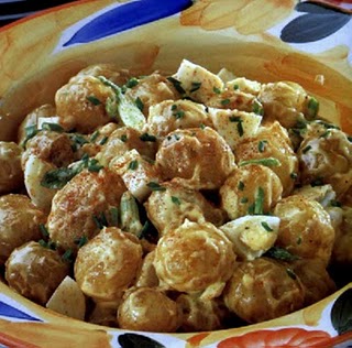 Leve ao lume um tacho com água e uma pitada de sal. Quando levantar fervura junte as batatas e deixe cozer durante 10-15 minutos. Escorra as batatas num passador e passe-as por água fria corrente até arrefecerem completamente. Escorra-as bem. Transfira para uma taça e reserve. Guarneça com 2 colheres (sopa) de cebolinho, cortado e pitadas de papikra.