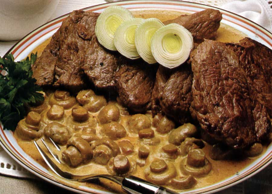 Ingredientes:100 g de margarina2 k de alcatra ou lombo de vitelaSal e pimenta1 cebola grande3 talos de aipo1 cenoura pequena2 dl de caldo de carne2 cálices de vinho da madeira1 cálice de conhaque2 dl de natas2 colheres (sopa) de amêndoasTorradasConfecção:Derreta num tacho a margarina, junte a carne da vitela cortada em pequenos cubos, salpique-os com pouco sal e deixe saltear até estarem dourados. Adicione a cebola, o aipo e a cenoura muito picadinhos, polvilhe com pimenta moída e revolva a carne durante 2-3 minutos para incorporar tudo bem. Tape imediatamente o tacho para estufar em lume brando, regando de vez em quando com o caldo de carne, até a carne estar tenra. Retire-a do tacho e conserve-as tapada em sítio quente. Reduze o molho a puré com a varinha, junte o vinho Madeira e o conhaque, deixe levantar fervura, adicione as natas e aqueça em lume brando, mexendo constantemente, mas sem deixar levantar fervura. Introduza de novo a carne e rectifique o sal e a pimenta. Coloque numa travessa e salpique com amêndoas.