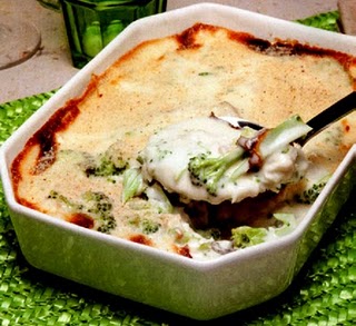 Coza a pescada, retire-a, escorra-a e deixa-a arrefecer. Limpe-a da pele e espinhas e lasque-a grosseiramente. Reserve. Arranje os brócolos, coza-os e coloque-os em água fria. Corte-os depois em pedaços. Descasque as cebolas e os dentes de alho, pique-os finamente e aloure-os no azeite. Junte depois a pescada, gengibre a gosto e os brócolos, envolva tudo suavemente e disponha num pirex. Regue tudo com o bechamel e polvilhe com pão ralado. Leve ao forno pré-aquecido a 200ºC até que fique douradinho. Retire do forno e sirva.