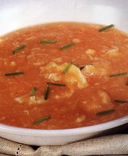 Corte as cebolas e os alhos em pedaços, assim como as cenouras; refogue-os no azeite. Junte ao preparado anterior o tomate e as batatas, em pedaços, e tempere de sal. Verta a água sobre a mistura anterior e deixe-a cozer lentamente em lume brando. Assim que tudo estiver cozido, triture bem e coe num passador. Acrescente os ovos à sopa, envolva e rectifique os temperos. Por fim, adicione o cebolinho e sirva.