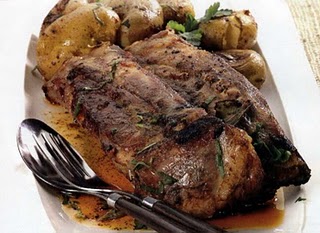 Na véspera, coloque o entrecosto num tabuleiro. Lave bem as batatas e junte-as ao entrecosto. Faça uma pasta, misturando a massa de pimentão, o tempero pronto de alho e louro, a banha, metade do azeite, o tempero completo Flor das Hortas, o sal, a pimenta branca e o piriri. barre a carne e as batatas com esta pasta e regue com o vinho. No próprio dia, ligue o forno a 180ºC. regue a carne com o azeite restante e leve o tabuleiro no forno. Deixe assar durante uma hora, virando os ingredientes a meio do tempo e regando ocasionalmente com o próprio molho. Sirva a carne com as batatas, regue com o molho e polvilhe com a salsa picada.