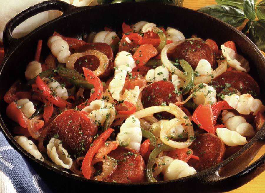 Descasque as cebolas e corte-as em rodelas finas. Abra ao meio os pimentos e as malaguetas, retire-lhes as sementes e lave-os. A seguir seque-os e corte-os em tiras finas. Corte o chouriço em rodelas de 1 cm de grossura. Dê uns golpes em cruz nos tomates, escalde-os em água quente, passe-os por água fria e tire-lhes a pele. Finalmente, corte-os em pedaços grosseiros. Derreta a manteiga e refogue nela as rodelas de cebola, até ficarem transparentes. Polvilhe com o colorau e adicione as rodelas de chouriço. frite bem dum lado e doutro, e por último junte os pimentos e as malaguetas. Deixe estufar durante cerca de 10 minutos, com o recipiente tapado. Junte os pedaços de tomate, tempere com sal e deixe cozinhar outros 20 minutos. Pouco antes do fim da cozedura, adicione a massa e aqueça-a. Polvilhe com ervas aromáticas picadas e sirva.