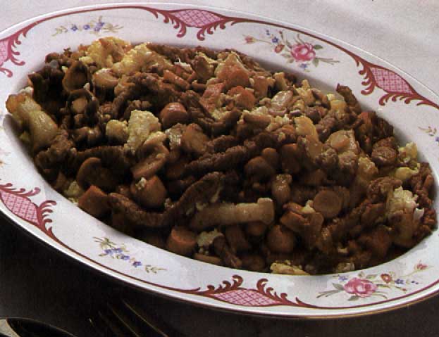 Corte a carne em cubos ou em tiras não muito finas e tempere com o alho, sumo de limão, sal e piripiri. Num tacho, leve ao lume óleo e manteiga, junte o bacon cortado em tiras, depois a carne e deixe fritar bem. Adicione em seguida as salsichascortadas às rodelas e os cogumelos previamente fervidos e também cortados, tempere com mostarda e misture bem. Numa tigela, mexa os ovos e leve-os ao lume a fritar, mexendo com um garfo para ficarem em farrapos. Misture-os com a carne, rectifique os temperos e sirva acompanhado de batata frita ou arroz branco.