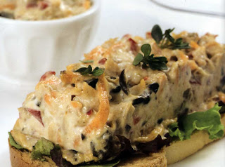 Rale finamente as cenouras; pique o pimento vermelho e as azeitonas pretas. Envolva tudo no atum, previamente escorrido e desfeito com o auxílio de um garfo. Acrescente a maionese; tempere de sal, pimenta e misture com as varas de arame, até obter uma pasta homogénea. Sirva com as bolachinhas ou o pão caseiro.