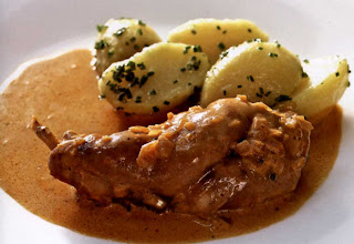 Tempere a carne com sal, pimenta e pimentão-doce. Descasque e pique finamente as cebolas, depois salteie numa panela larga com manteiga, até ficarem translúcidas. Adicione as coxas de coelho e aloure ligeiramente dos dois lados. Deite o caldo de galinha e deixe guisar durante cerca de 30 minutos, com tampa. Vire a carne de vez enquandoe, sendo que o fundo da panela deve estar sempre coberto com 1 cm de líquido, talvez tenha de adicionar água caso este evapore muito depressa. Deite as natas e deixe o coelho fervilhar suavemente no molho. Talvez tenha de temperar o guisado com mais sal e pimenta. Sirva acompanhado de crôutons (cubinhos de pão temperados com azeite e orégãos e torrados no forno (20 minutos) ou microondas (4-6 minutos na potência máxima) com batatas cozidas e temperadas ou talharim cozido.