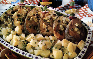 Lave o cação e corte-o em 6 postas. Enxugue-as depois num guardanapo e, antes de fritá-las, prepare o molho. Pique a salsa e os coentros. À parte, amasse os pepinos. Descasque o limão e corte-o em fatias. Divida as fatias em quadrados pequenos. Leve ao fogo uma frigideira com 4 colheres (sopa) de óleo. Junte os pepinos amassados, as alcaparras, os pedaços de limão, a anchova amassada com um garfo e, por último, a salsa e os coentros picados. Prove e, se for necessário, rectifique o sal. Deixe cozinhar por alguns minutos. Passe as postas de peixe na farinha de trigo e frite-as em óleo bem quente. Escorra-as bem, arrume-as numa travessa e despeje por cima o molho quente. Um bom acompanhamento para este prato são batatas cozidas em água e sal e depois temperadas com óleo, vinagre, salsa e coentros.